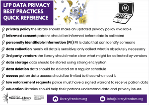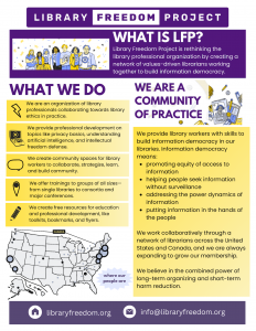 As an academic librarian I’m frequently having to explain to administrators why I won’t collect patron and library use data – LFP has provided me with the knowledge, skills, and community to do this effectively.